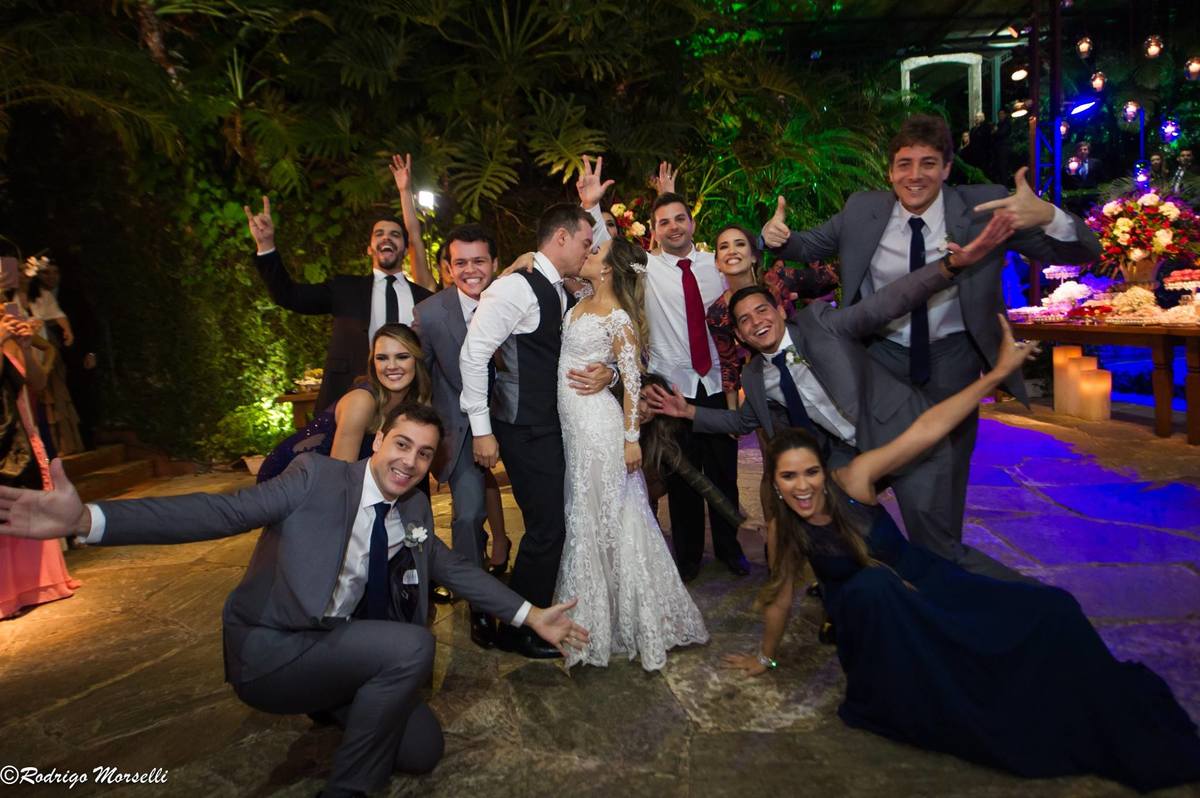 beijo dos noivos entre os padrinhos na casa de festas Quinta do Chapecó no Rio de Janeiro